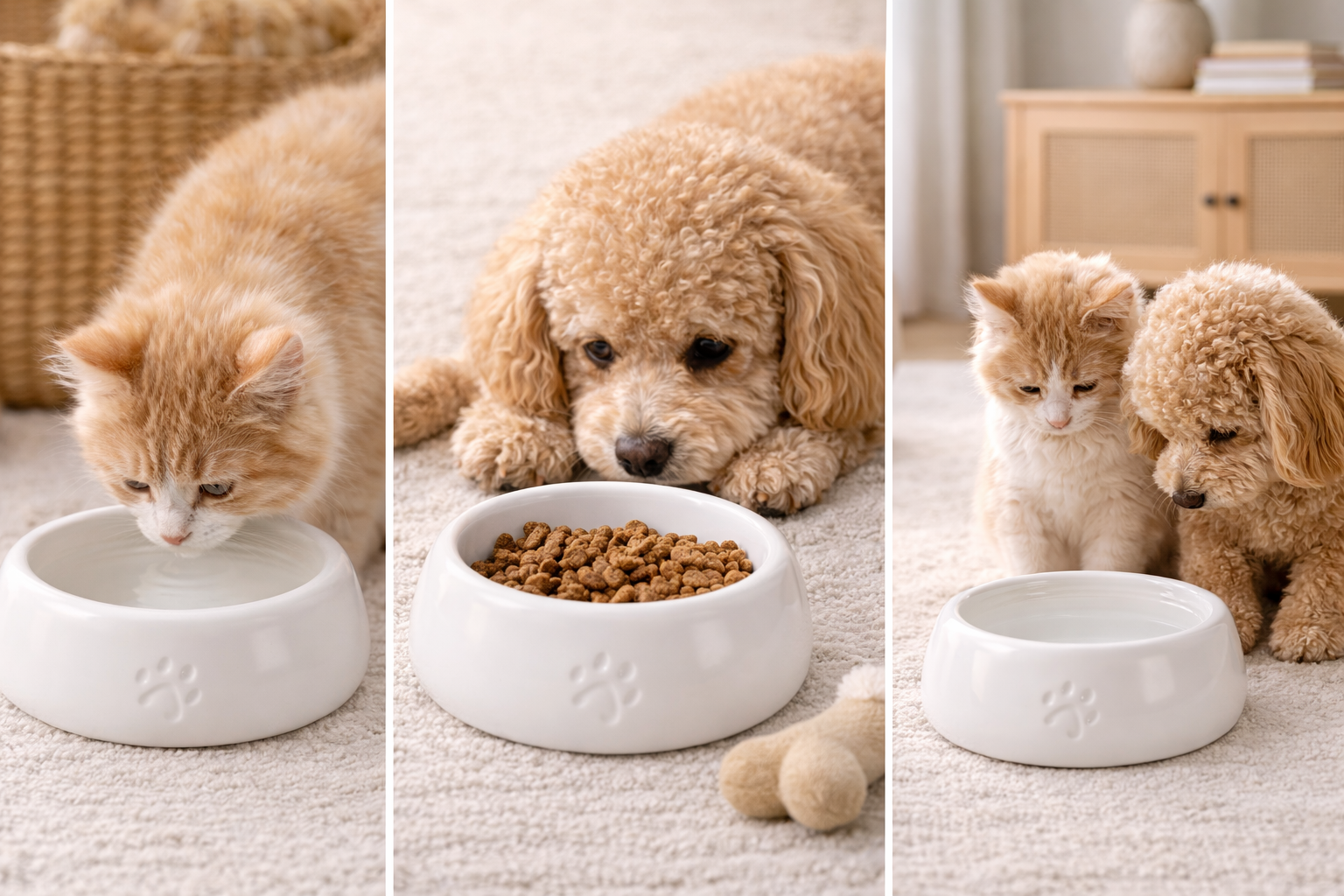 A wide-mouth ceramic bowl designed to support comfortable, stress-free feeding for both cats and dogs.